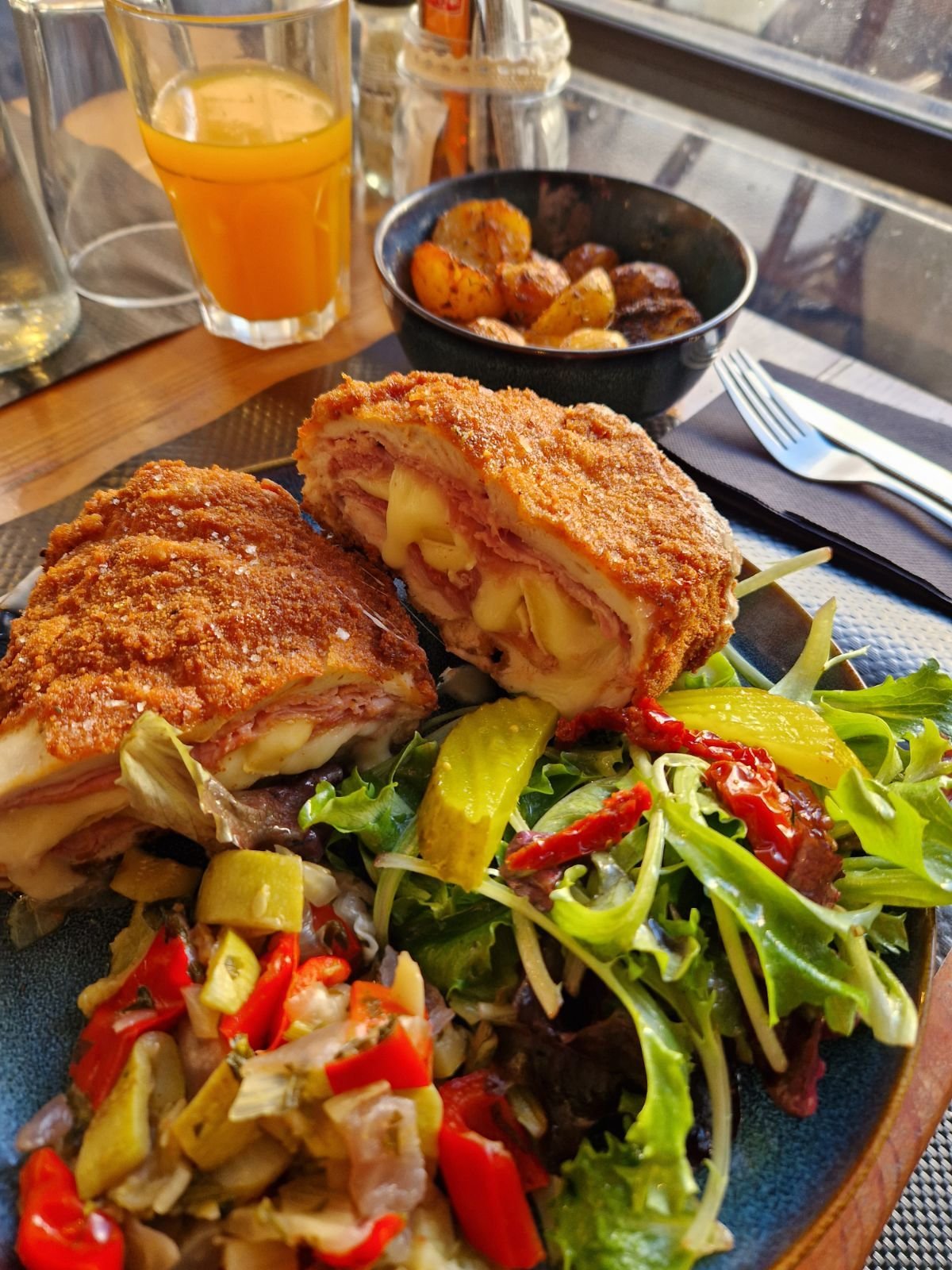 Servi avec des frites à la graisse de veau ou des pommes de terres grenailles rôties, poêlée de légumes du moment et mesclun niçois