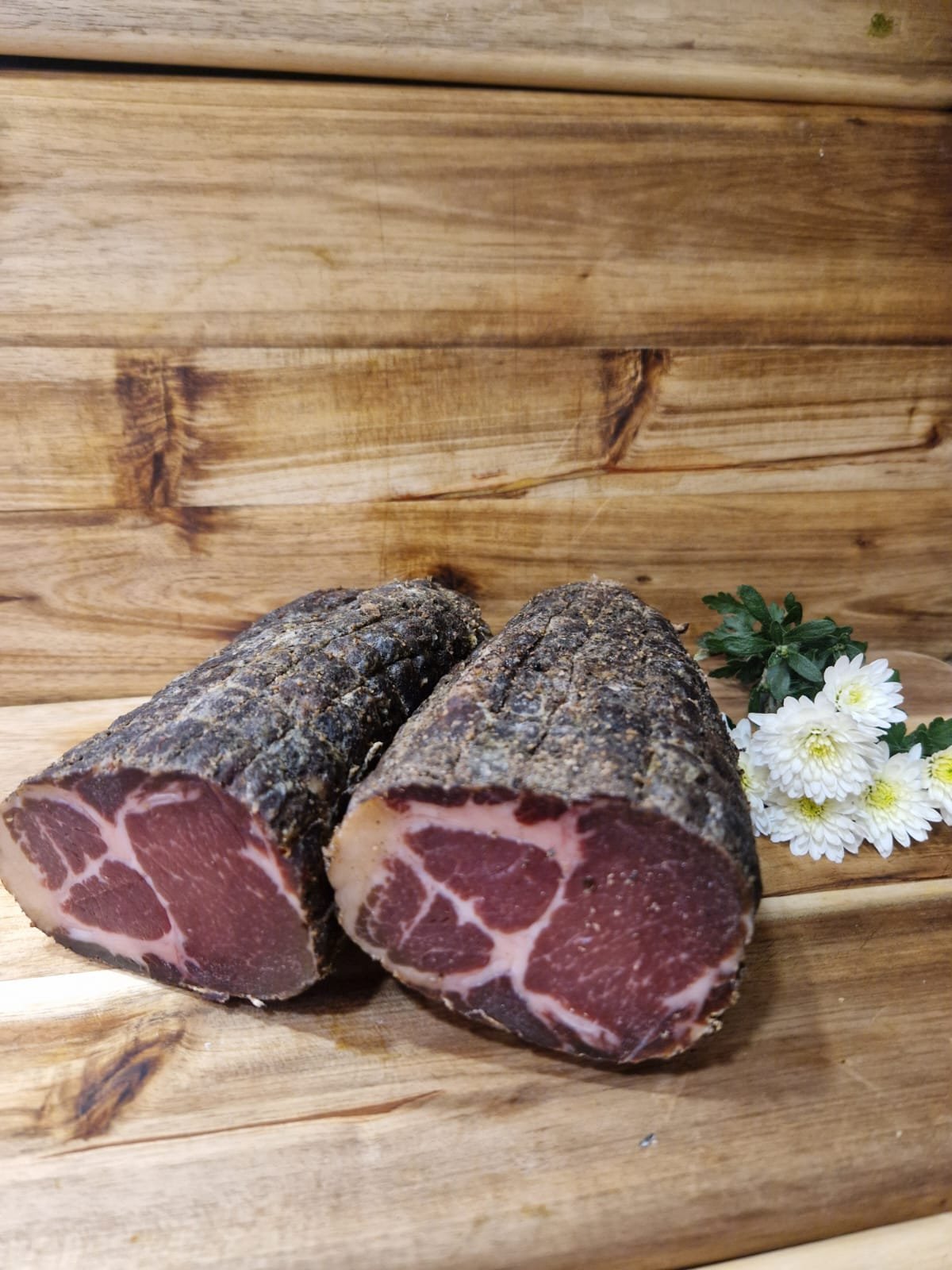 Coppa corse, charcuterie sèche à base d’échine de porc, prête à être dégustée en tranches fines.