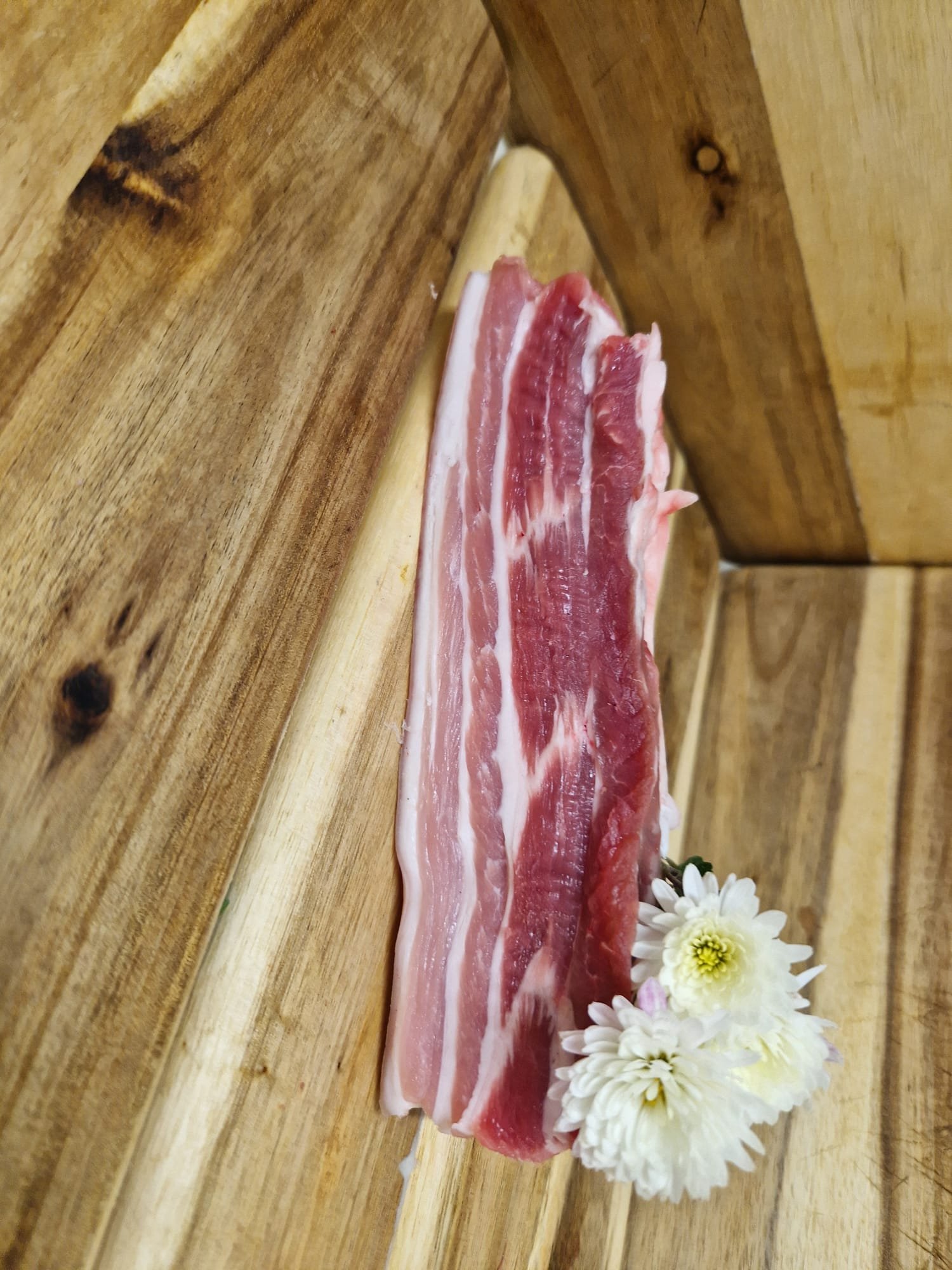Poitrine de porc salée, prête à cuire ou à déguster en tranches fines grillée. 100gr la tranche – 18,90€/kg